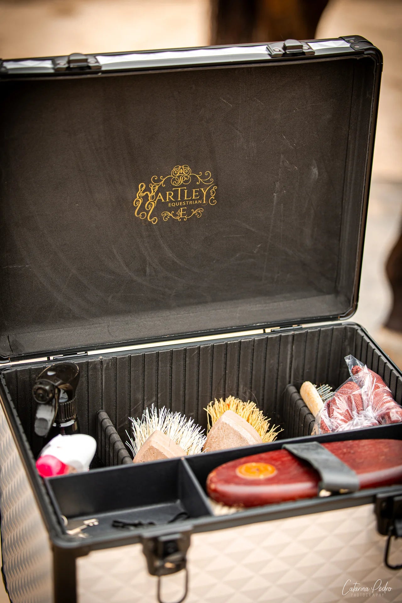 Discover the ultimate grooming box, crafted with precision and luxury in mind. This durable and stylish box features shock-absorbing foam, removable partitions, and a lockable key for organization and safety. Easily transport and place with reinforced handles and padded feet. Available in elegant colors and sizes to elevate your tack room.