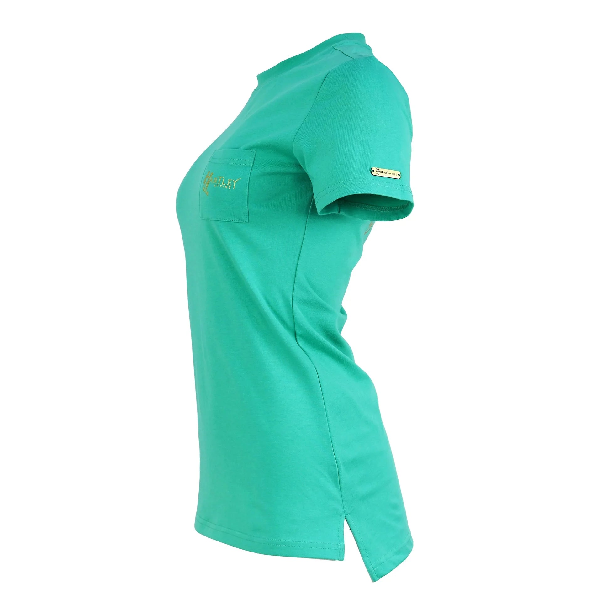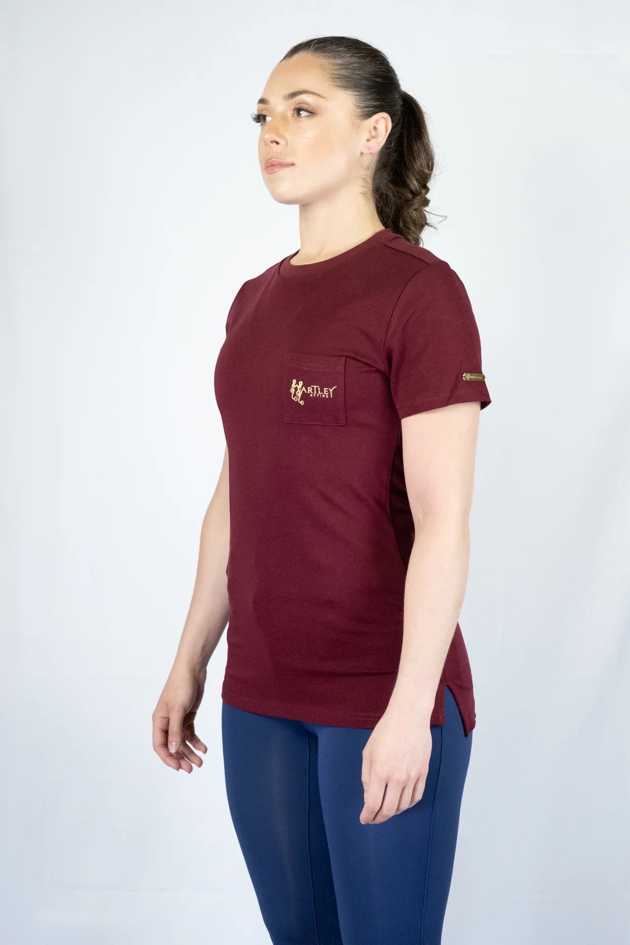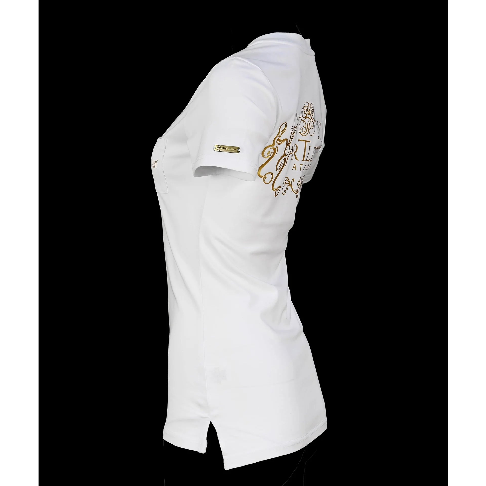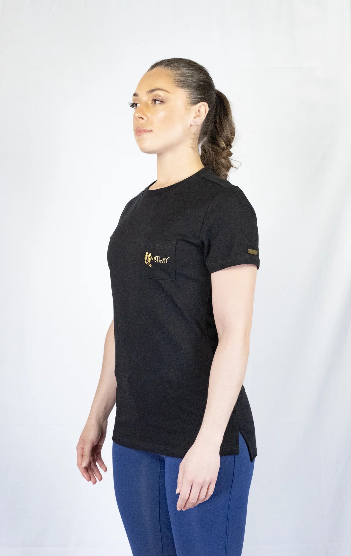 Experience luxurious and timeless style with the Classic Hartley Attire Round Neck T-Shirt.  Crafted from quality, heavier cotton for durability and sophistication.  Featuring a longline silhouette, side split hem, front pocket, full logo on the back, and engraved metal tab on the sleeve.  A versatile piece for any woman, perfect for transitioning from the saddle to the town.