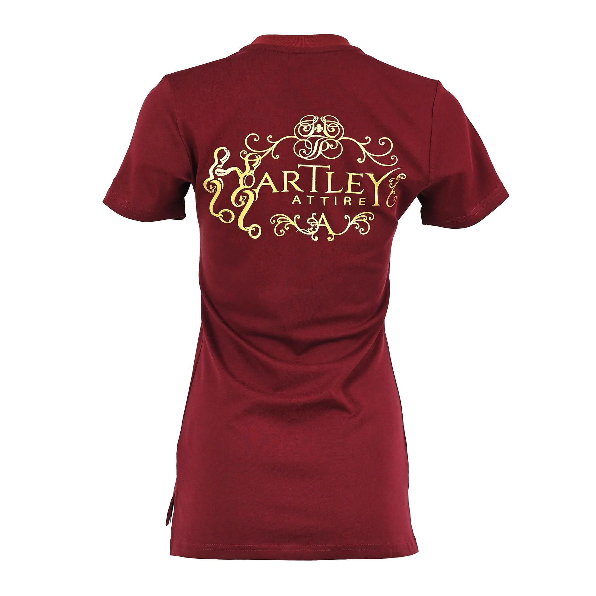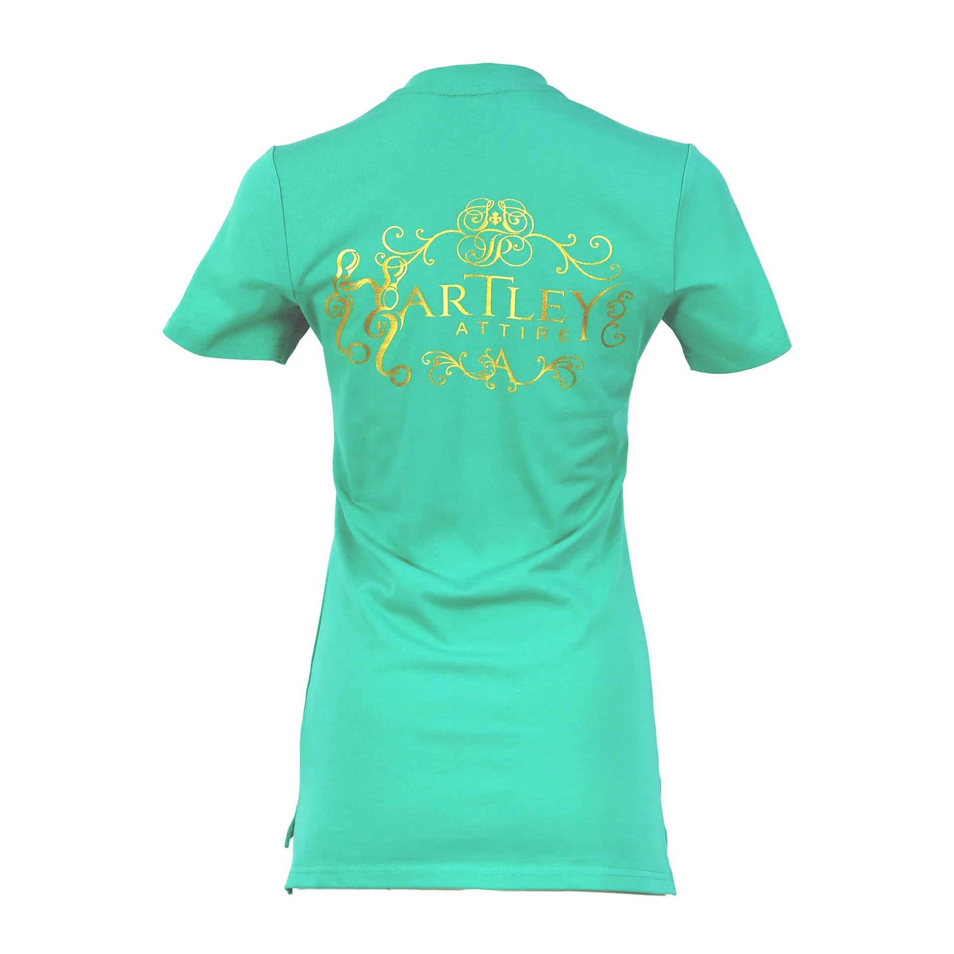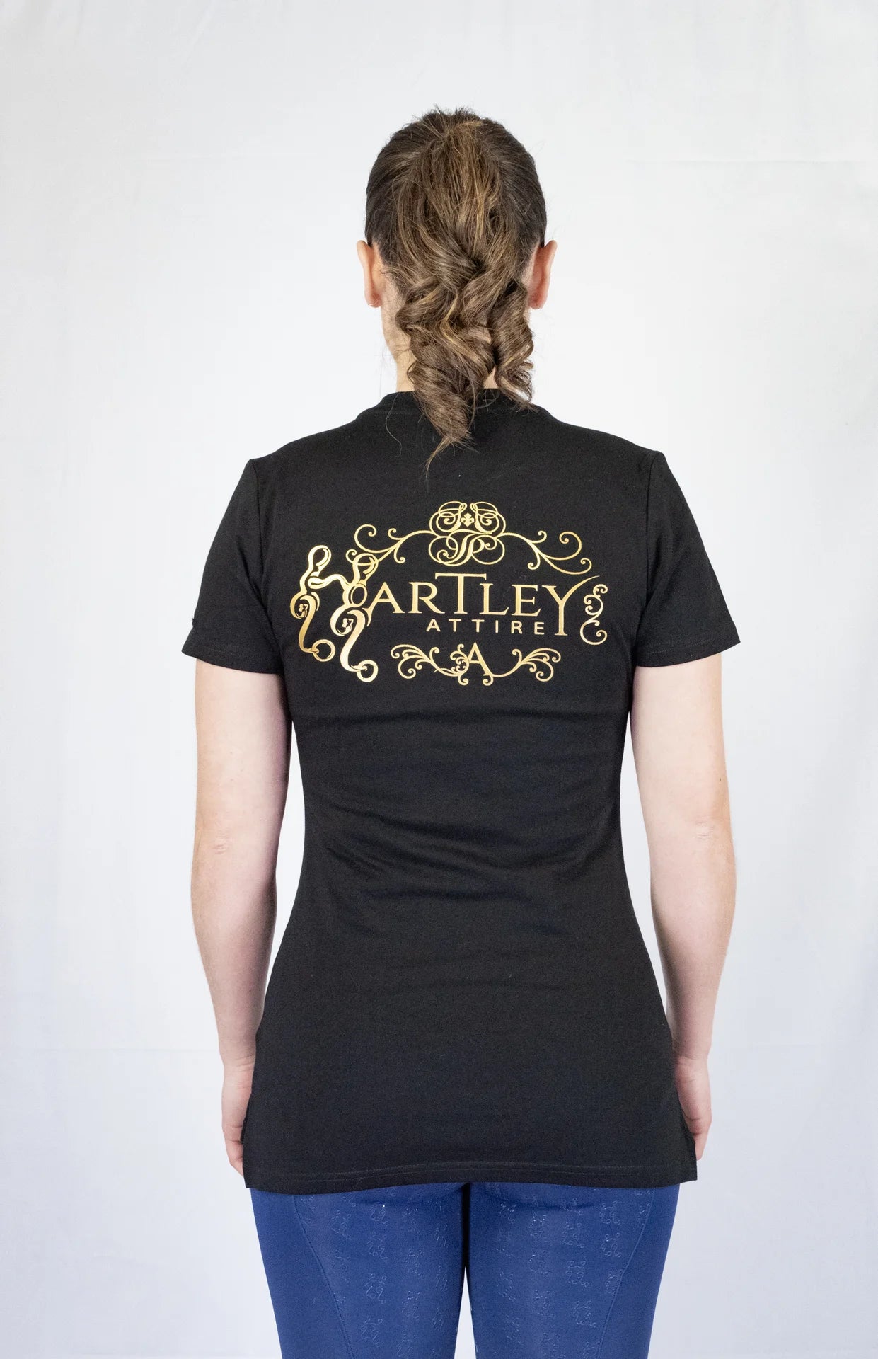 Experience luxurious and timeless style with the Classic Hartley Attire Round Neck T-Shirt.  Crafted from quality, heavier cotton for durability and sophistication.  Featuring a longline silhouette, side split hem, front pocket, full logo on the back, and engraved metal tab on the sleeve.  A versatile piece for any woman, perfect for transitioning from the saddle to the town.