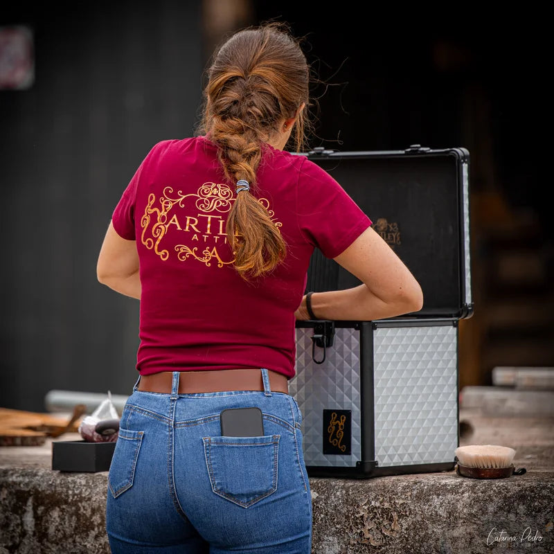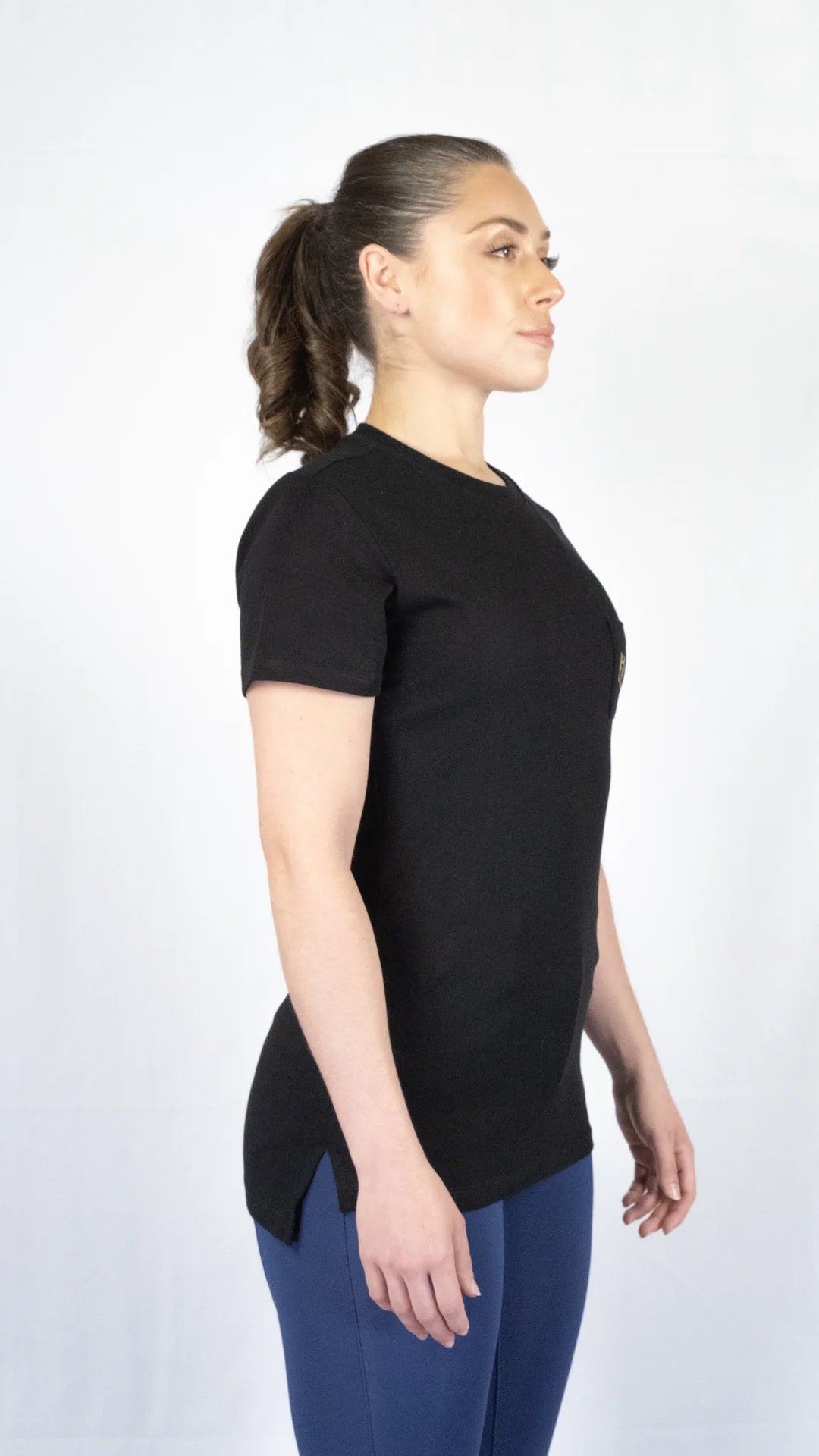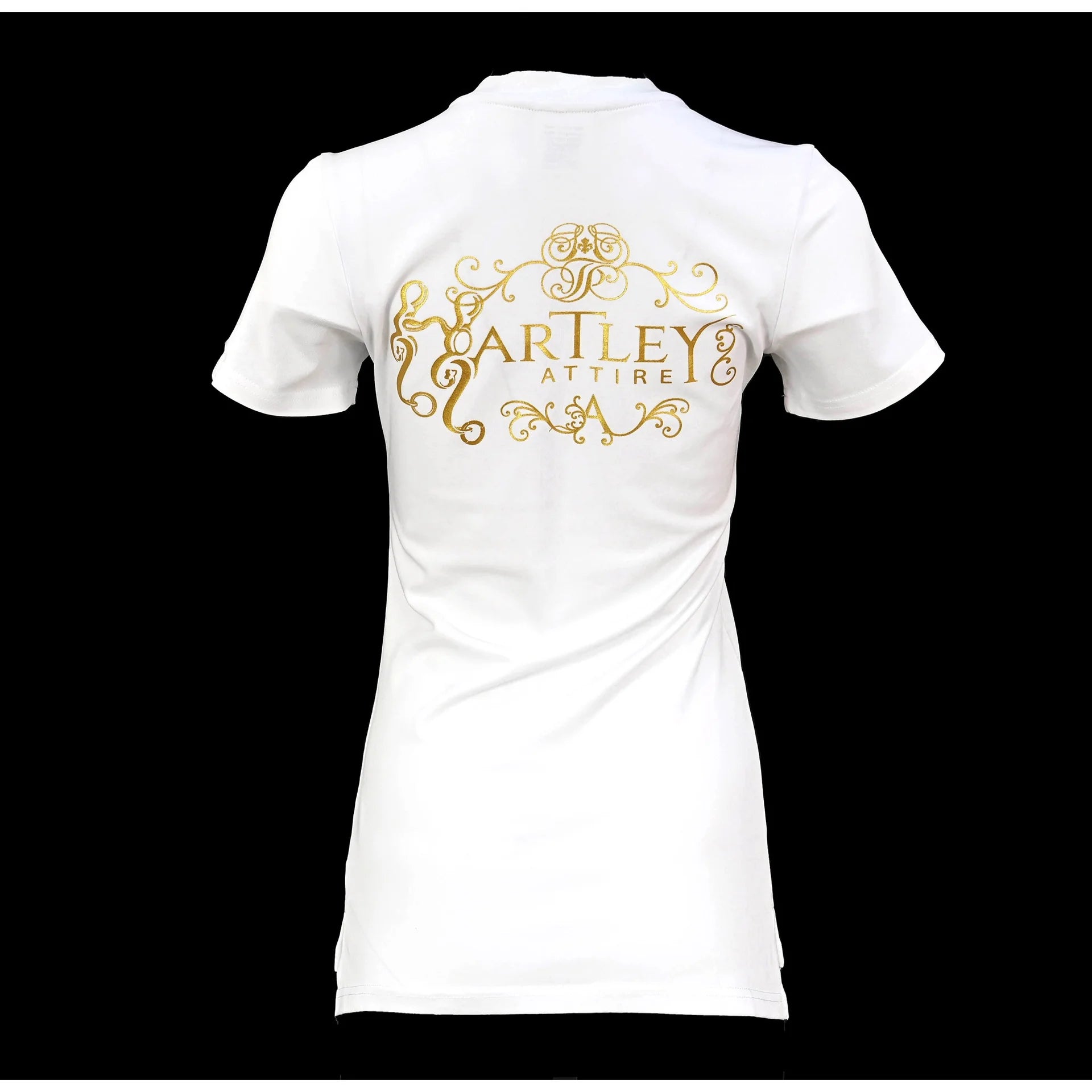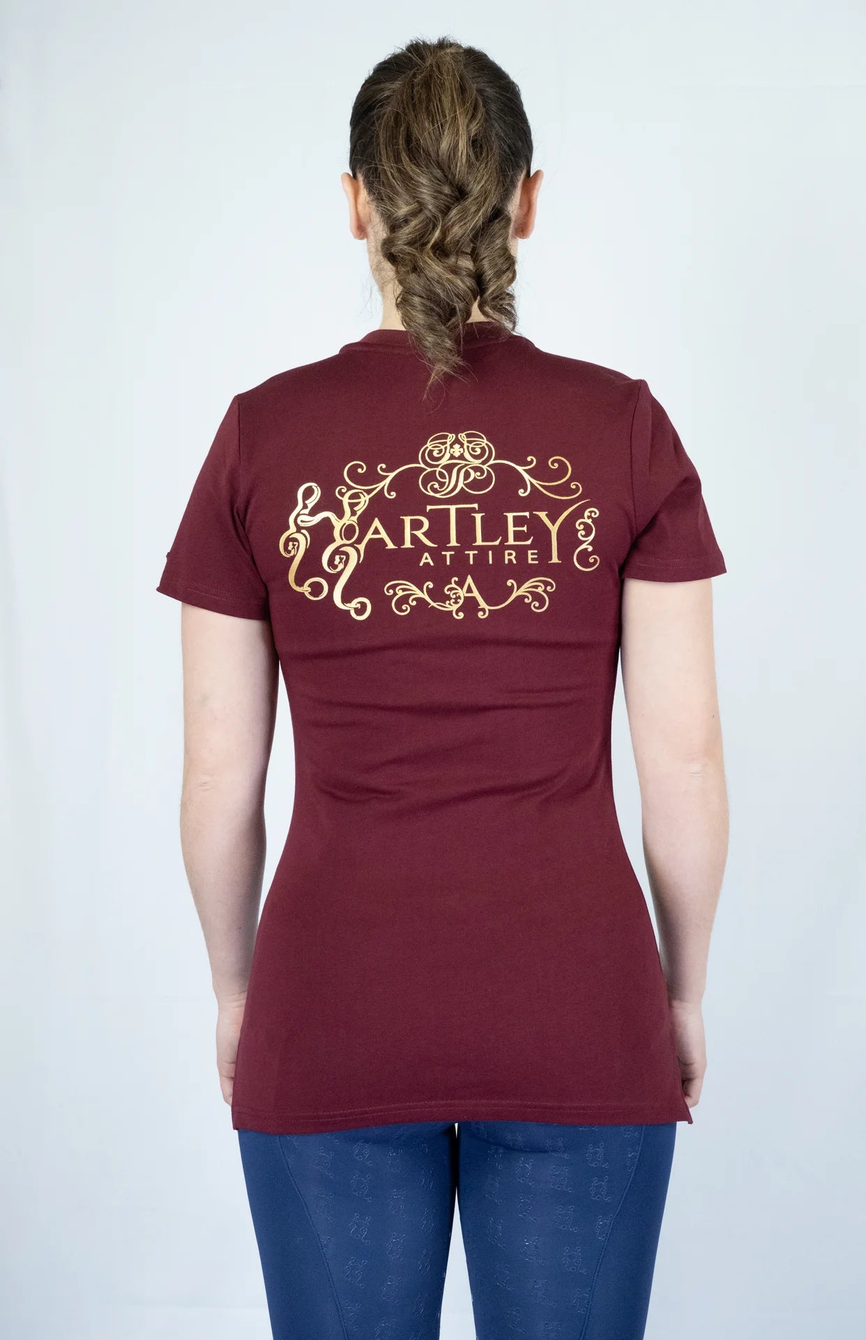Experience luxurious and timeless style with the Classic Hartley Attire Round Neck T-Shirt.  Crafted from quality, heavier cotton for durability and sophistication.  Featuring a longline silhouette, side split hem, front pocket, full logo on the back, and engraved metal tab on the sleeve.  A versatile piece for any woman, perfect for transitioning from the saddle to the town.